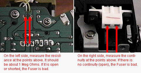 If that checks out ok, remove the small black screw that holds the plastic cover on the left side of the fuser, and test the two contacts detailed in the picture below. There should be about 1meg ohms resistance at room temperature--if it's wildly off, the thermistor is bad, and as far as I know you'll have to get a new board, if one doesn't come with a new fuser.